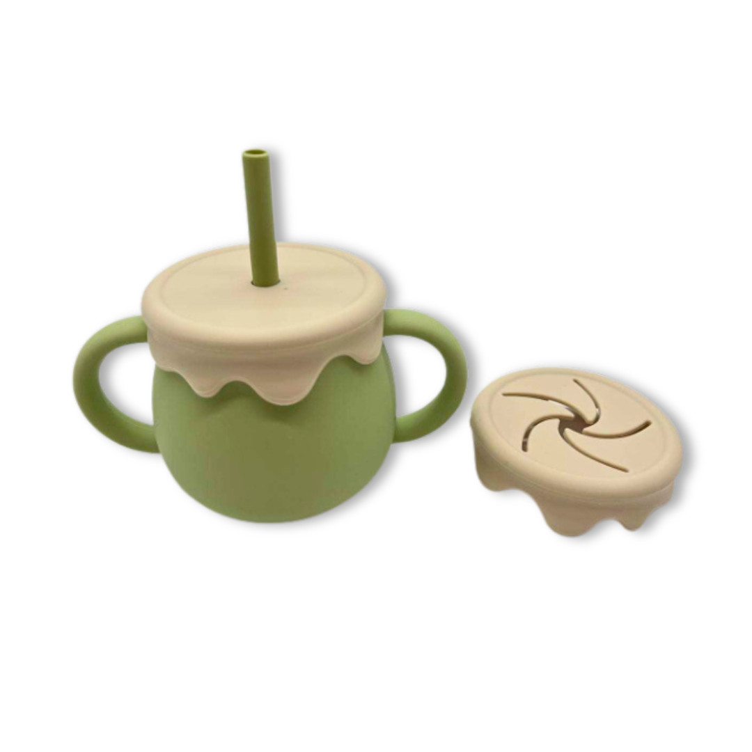 Το ποτηράκι σιλικόνης διαθέτει καπάκι, καλαμάκι & επιπλέον καπάκι για να τρώει το παιδί σνακ. Και τα δυο καπάκια έχουν φανταστικό σχέδιο με εφέ κρέμας που ξεχωρίζουν από τα συνηθισμένα!