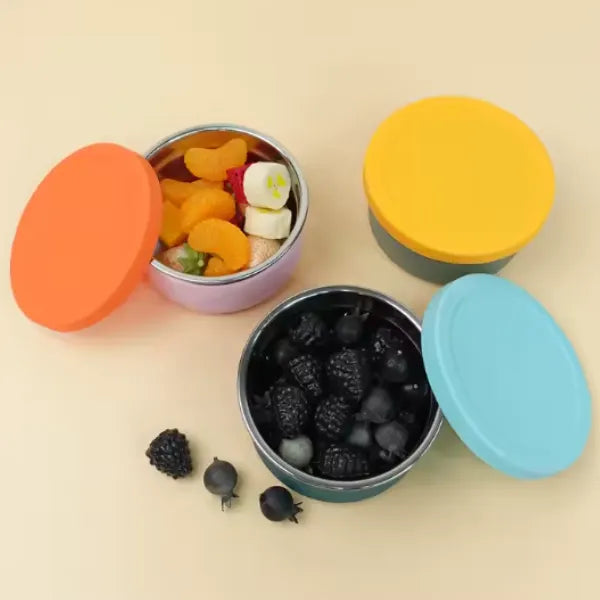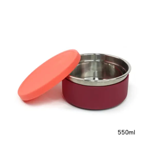 Στρογγυλό φαγητοδοχείο 550ml από ανοξείδωτο ατσάλι, ιδανικό για γεύματα στο σπίτι, στο σχολείο ή στη δουλειά. Διαθέτει εξωτερικό δοχείο σιλικόνης που προσφέρει επιπλέον μόνωση και μπορεί να χρησιμοποιηθεί ανεξάρτητα ως δεύτερο σκεύος. Το καπάκι σιλικόνης κλείνει αεροστεγώς το ανοξείδωτο δοχείο, διατηρώντας το φαγητό φρέσκο και αποτρέποντας διαρροές.