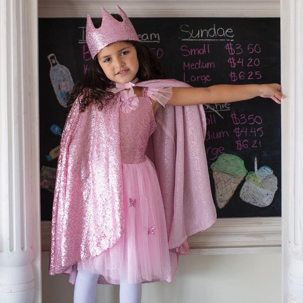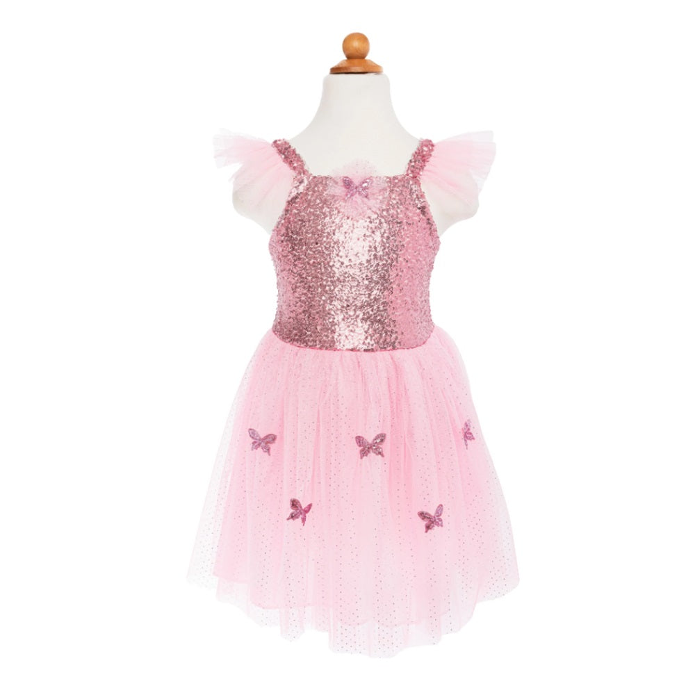 Μια ωραία πεταλούδα σε έναν κάμπο μια φορά… φορούσε λαμπερό ροζ φόρεμα tutu! Το επάνω μέρος αυτού του αξιολάτρευτου φορέματος είναι διακοσμημένο με ιριδίζουσες πούλιες ενώ πρωταγωνιστεί κεντρικά μια πεταλούδα. Η λαμπερή φουστίτσα του επίσης κοσμείται από πεταλουδίτσες. Οι τιράντες του είναι κατασκευασμένες με ελαστικό spandex και διαθέτουν και αυτές λεπτομέρειες από τούλι. Την εμφάνιση ολοκληρώνουν τα πασπαλισμένα με γκλίτερ, λαμπερά φτερά. Κατάλληλο από 4 έως 7 ετών.
